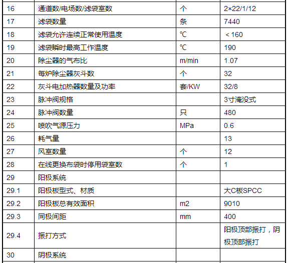 4 在原電除塵器的第二、三、四電場原立柱頂面水平鋪設花板,安裝濾袋、籠骨和噴吹系統,作為布袋除塵區。布袋除塵區每臺爐在寬度方向分為4列、每列分為3個室。每臺爐分24個清灰單元、共480個三寸脈沖閥、共7440條濾袋。布袋除塵采用外濾式,噴吹系統選用固定行噴吹清灰技術。每室1個人孔門,每個室之間相互獨立。在運行中如果某個室出現故障,關閉該室的離線閥、打開人孔門實現不停爐分室檢修(即可以實現不停爐進行更換布袋操作);也可以在運行時關閉某個室離線閥,實現離線清灰,保證清灰效果。