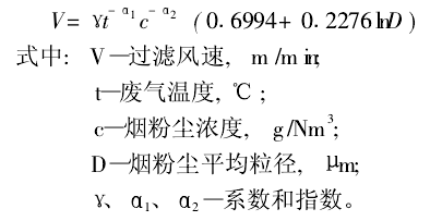 由此可見,脈沖清灰袋式除塵器過濾風(fēng)速與廢氣溫度和廢氣中的煙粉塵濃度成反比,與煙粉塵粒徑的對(duì)數(shù)成正比。