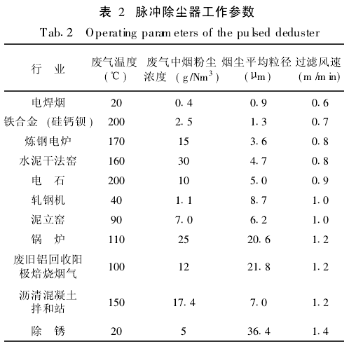 過濾風(fēng)速到底和廢氣溫度、煙粉塵濃度有何具體關(guān)系,我們可從實(shí)驗(yàn)上加以研究,表2是作者為各行業(yè)設(shè)計(jì)的除塵器的工作參數(shù)表(僅選取了除塵效率在9919%以上的設(shè)備或出口排放濃度小于30mg/Nm3的設(shè)備)。